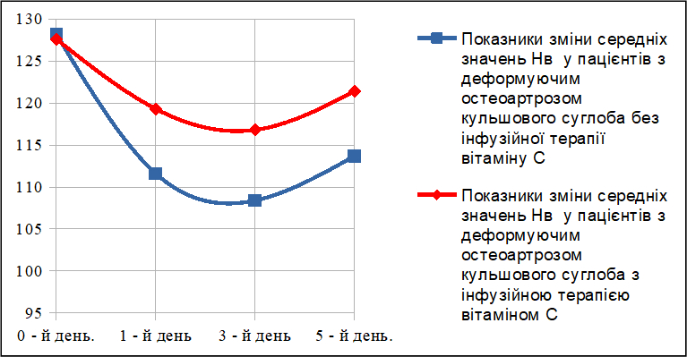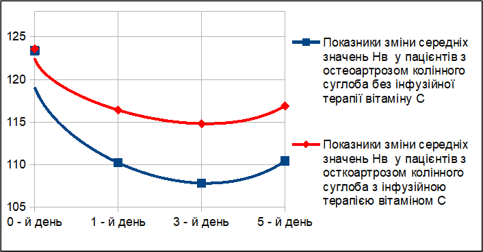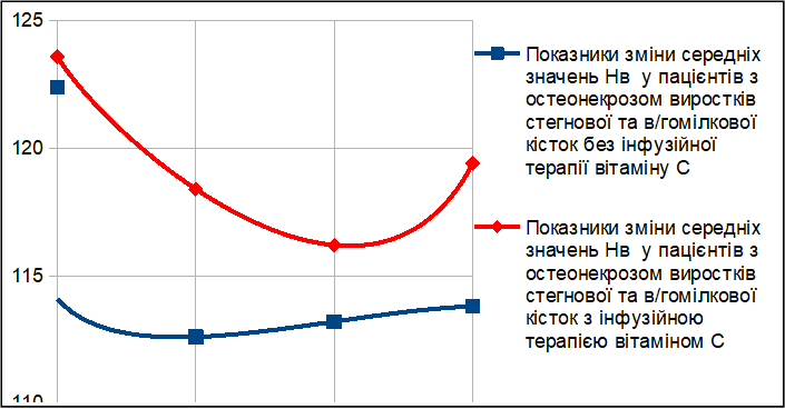 Проведений аналіз зміни середніх значень показника гемоглобіну в ранньому післяопераційному періоді у пацієнтів з диспластичним коксартрозом, яким виконано тотальне ендопротезування кульшового суглоба з використанням інфузійної терапії вітаміну С 7,5 -15 гр. та без неї показав, що діаграмічно крива падіння гемоглобіну у пацієнтів з використанням високодозованої внутрішньовенної терапії вітаміном С менша, а показники відновлення гемоглобіну з 1-го по 5-й день на 7,4 г/л вищі.