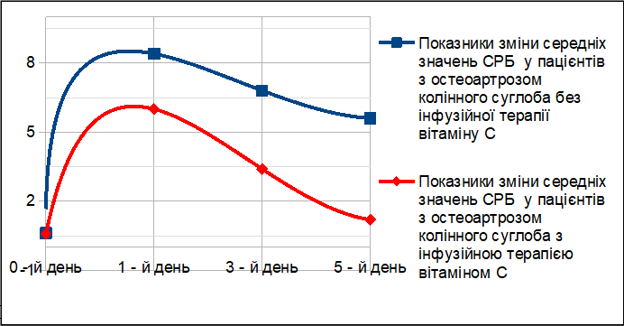 Проведений аналіз зміни середніх значень показника С-реактивного білка в ранньому післяопераційному періоді у пацієнтів з остеоартрозом колінного суглоба, яким виконано тотальне ендопротезування колінного суглоба з використанням інфузійної терапії вітаміну С 7,5 - 15 гр. та без неї показав, що діаграмічно крива підняття С-реактивного білка у пацієнтів з використанням високодозованої внутрішньовенної терапії вітаміном С менша, а показники зменшення С- реактивного білка з 1-го по 5-й день на 4,8 ммоль/л нижчі.