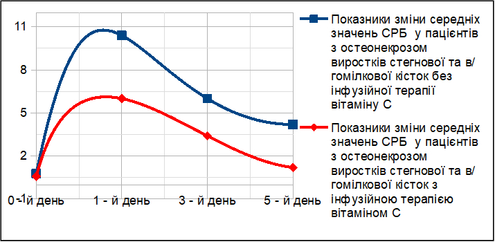 Проведений аналіз зміни середніх значень показника С-реактивного білка в ранньому післяопераційному періоді у пацієнтів з остеонекрозом виростків стегнової та в/гомілкової кісток, яким виконано тотальне ендопротезування колінного суглоба з використанням інфузійної терапії вітаміну С 7,5 - 15 гр. та без неї показав, що діаграмічно крива підняття С-реактивного білка у пацієнтів з використанням високодозованої внутрішньовенної терапії вітаміном С менша, а показники зменшення С- реактивного білка з 1-го по 5-й день на 6,4 ммоль/л нижчі.