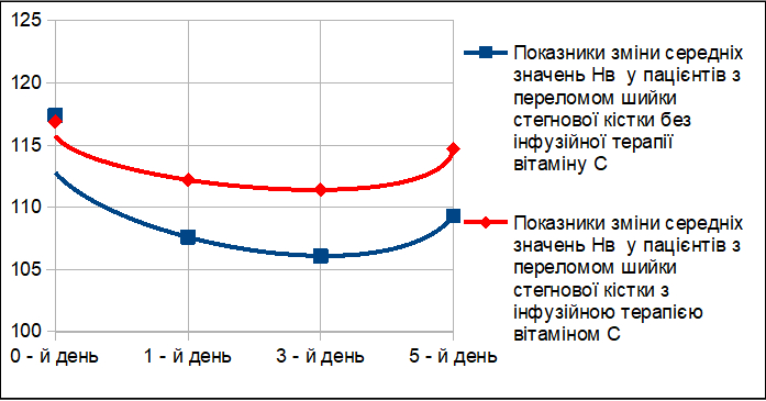 Проведений аналіз зміни середніх значень показника гемоглобіну в ранньому післяопераційному періоді у пацієнтів з переломом шийки стегнової кістки, яким виконано тотальне ендопротезування кульшового суглоба з використанням інфузійної терапії вітаміну С 7,5 - 15 гр. та без неї показав, що діаграмічно крива падіння гемоглобіну у пацієнтів з використанням високодозованої внутрішньовенної терапії вітаміном С менша, а показники відновлення гемоглобіну з 1-го по 5-й день на 7,2 г/л вищі.