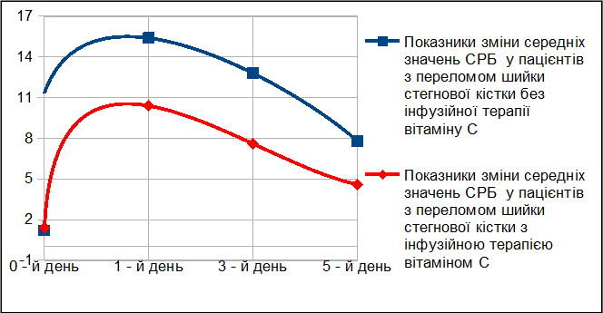 Проведений аналіз зміни середніх значень показника С-реактивного білка в ранньому післяопераційному періоді у пацієнтів з переломом шийки стегнової кістки, яким виконано тотальне ендопротезування кульшового суглоба з використанням інфузійної терапії вітаміну С 7,5 - 15 гр. та без неї показав, що діаграмічно крива підняття С-реактивного білка у пацієнтів з використанням високодозованої внутрішньовенної терапії вітаміном С менша, а показники зменшення С- реактивного білка з 1-го по 5-й день на 6,8 ммоль/л нижчі.