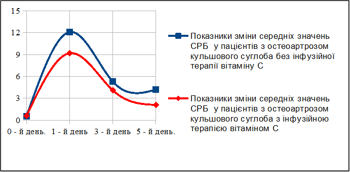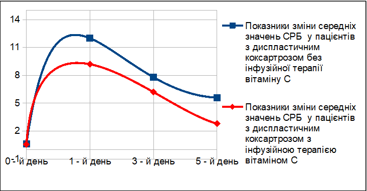 Проведений аналіз зміни середніх значень показника С-реактивного білка в ранньому післяопераційному періоді у пацієнтів з диспластичним коксартрозом, яким виконано тотальне ендопротезування кульшового суглоба з використанням інфузійної терапії вітаміну С 7,5 - 15 гр. та без неї показав, що діаграмічно крива підняття С-реактивного білка у пацієнтів з використанням високодозованої внутрішньовенної терапії вітаміном С менша, а показники зменшення С- реактивного білка з 1-го по 5-й день на 3,2 ммоль/л нижчі.