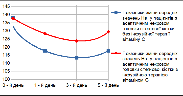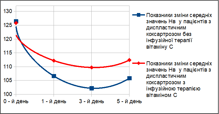 Проведений аналіз зміни середніх значень показника гемоглобіну в ранньому післяопераційному періоді у пацієнтів з диспластичним коксартрозом, яким виконано тотальне ендопротезування кульшового суглоба з використанням інфузійної терапії вітаміну С 7,5 -15 гр. та без неї показав, що діаграмічно крива падіння гемоглобіну у пацієнтів з використанням високодозованої внутрішньовенної терапії вітаміном С менша, а показники відновлення гемоглобіну з 1-го по 5-й день на 7,4 г/л вищі.