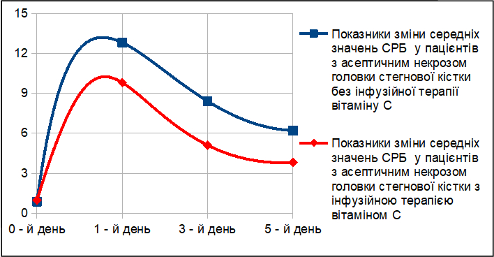Проведений аналіз зміни середніх значень показника С-реактивного білка в ранньому післяопераційному періоді у пацієнтів з асептичним некрозом головки стегнової кістки, яким виконано тотальне ендопротезування кульшового суглоба з використанням інфузійної терапії вітаміну С 7,5 - 15 гр. та без неї показав, що діаграмічно крива підняття С-реактивного білка у пацієнтів з використанням високодозованої внутрішньовенної терапії вітаміном С менша, а показники зменшення С- реактивного білка з 1-го по 5-й день на 5,2 ммоль/л нижчі.